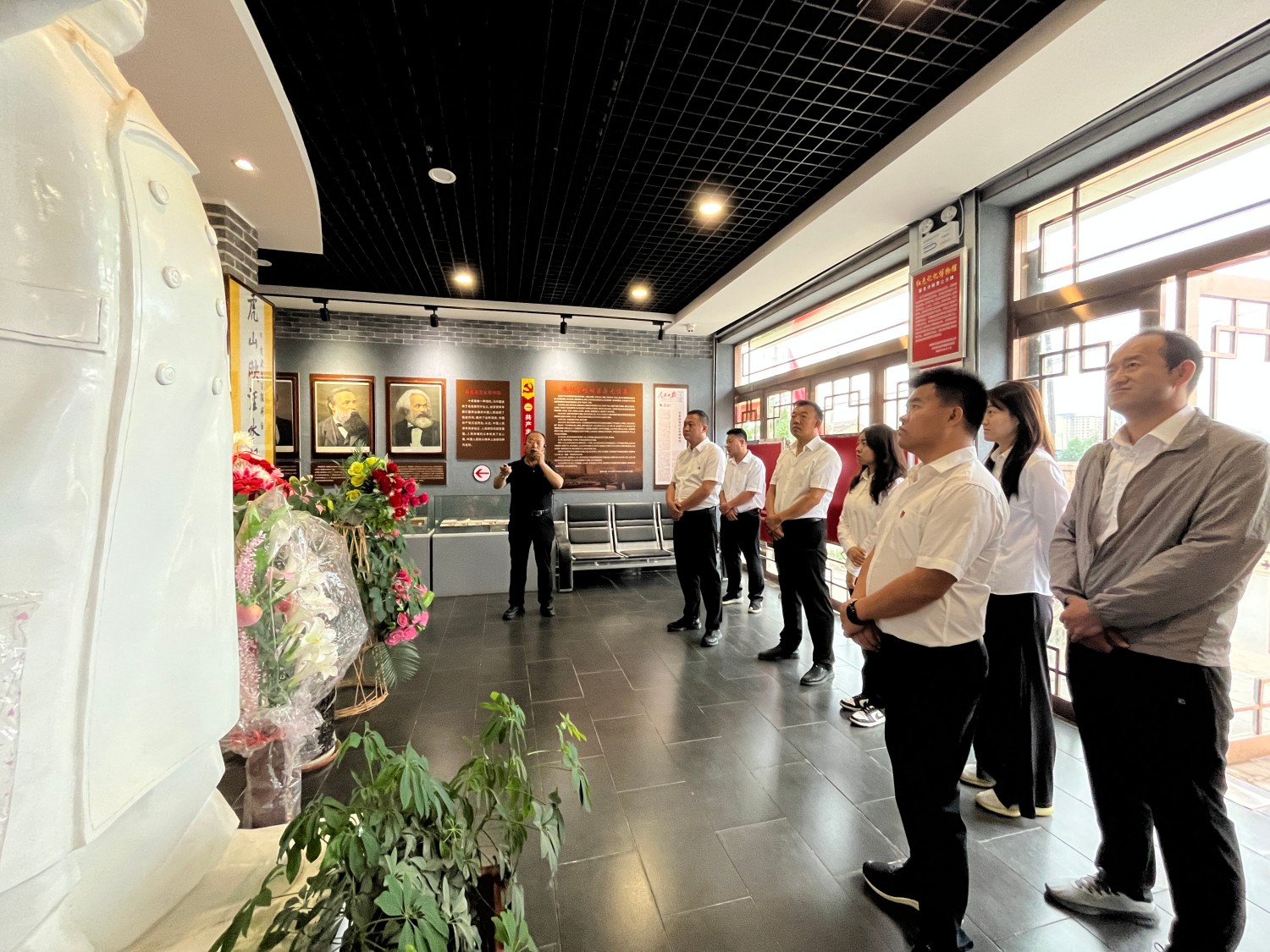 全體黨員及團(tuán)員青年在講解員的帶領(lǐng)下,以革命活動為主線,以事件發(fā)展為經(jīng)緯,沿著歷史脈絡(luò),依次走進(jìn)各個展區(qū),從共產(chǎn)主義火種在中國大地的悄然播撒,到紅二十五軍在平?jīng)鲈⊙獖^戰(zhàn)的壯烈場景,再到新時代隴東地區(qū)蓬勃發(fā)展的嶄新畫卷,每一處展示都訴說著一段波瀾壯闊的歷史。展柜里,泛黃的革命文獻(xiàn)、銹跡斑斑的武器裝備、滿是補丁的舊軍裝,無聲卻有力地講述著往昔的崢嶸歲月。大家時而駐足凝視展品,時而低聲交流感悟,在一件件承載著革命精神的實物前,深入了解革命時期發(fā)生在隴東地區(qū)的英勇事跡和鄉(xiāng)村發(fā)展變遷,深刻感受革命先輩們堅定的理想信念與無私奉獻(xiàn)精神。參觀結(jié)束后,全體黨員整齊列隊,高舉右拳,面對鮮紅的黨旗重溫入黨誓詞。鏗鏘有力的誓言回蕩在現(xiàn)場,讓每一位黨員的心靈再次受到震撼和洗禮,進(jìn)一步堅定理想信念,強(qiáng)化黨性意識。